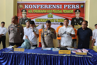Langkat, JATANRASNEWS | Kapolres langkat AKBP FAISAL RAHMAT HUSEIN SIMATUPANG, SIK, SH, MH yang di wakili oleh Waka Polres Langkat KOMPOL HENDRI N.D BARUS SH, SIK, MM menggelar konfrensi pers hasil penangkapan kasus tindak pidana narkotika, premanisme dan perjudian di wilayah hukum polres langkat yang bertempat di Aula Bharadaksa Polres Langkat Jalan. Proklamasi Kecamatan Stabat Kabupaten Langkat, Senin (29/5/23).