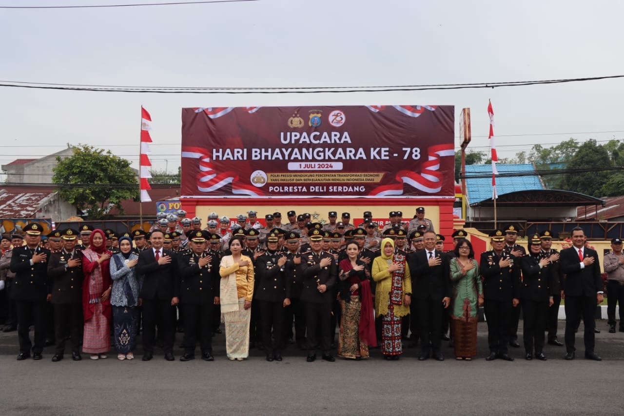 DELI SERDANG,Jatanras-News | Dalam rangka memperingati Hari Ulang Tahun (HUT) Bhayangkara Ke-78 Tahun 2024, Kepolisian Resor Kota Deli Serdang menggelar upacara yang berlangsung khidmat di halaman Mapolresta Deli serdng pada Senin pagi (1/7/2024).