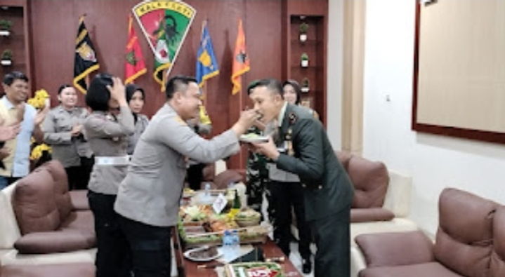 Kapolres Batu Bara diwakili Waka Polres Kompol lmam Alyuddin, SH. MH, berikan nasi tumpeng tersebut kepada Komandan Bataliyon 126/KC dibarengi dengan ucapan selamat HUT TNI ke 79 dan terus berjaya.