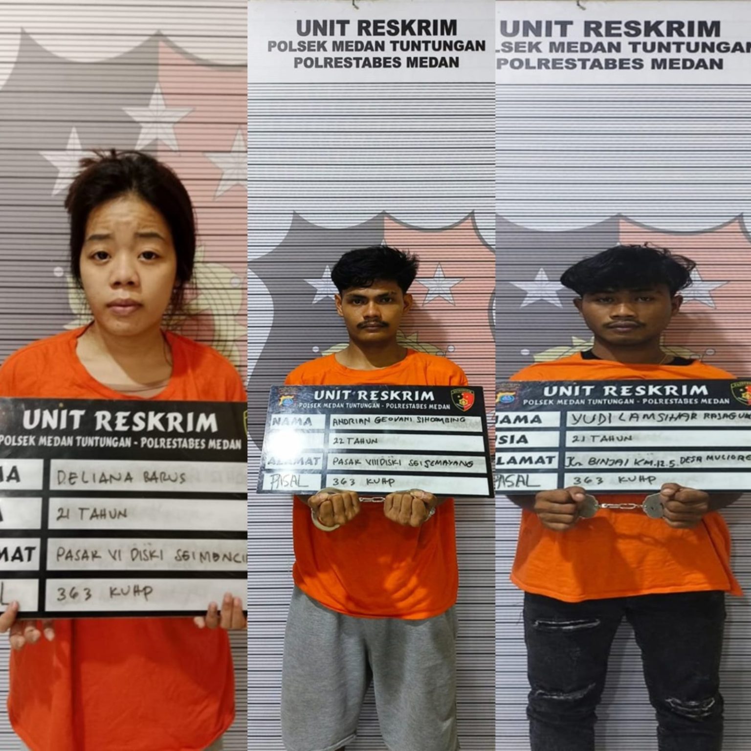 Ketiga pelaku tersebut bernama Andrian Geovani Sihombing (22), Yudi Lamsihar Raja Guk-guk (21) dan Deliana br Barus (21).