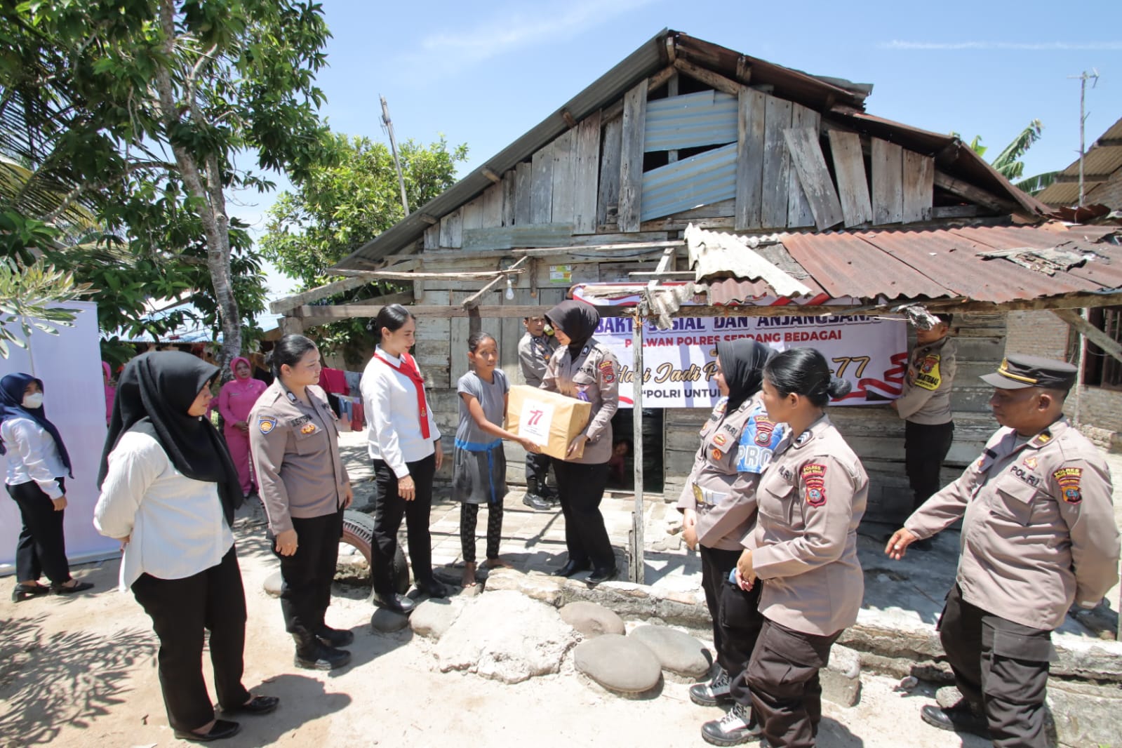 SERGAI, JATANRAS-news.com ||Dalam rangka menyambut Hari Ulang Tahun (HUT) ke-77 Polisi Wanita (Polwan) Tahun 2025 yang jatuh pada tanggal 1 September, Polres Serdang Bedagai (Sergai) lewat giat Polwan Peduli mengadakan kegiatan berbagi bantuan sosial (bansos) berupa pemberian paket sembako kepada warga terdampak bencana puting beliung di Desa Sentang Kecamatan Teluk Mengkudu Kabupaten Sergai, Selasa (26/8/2025).
