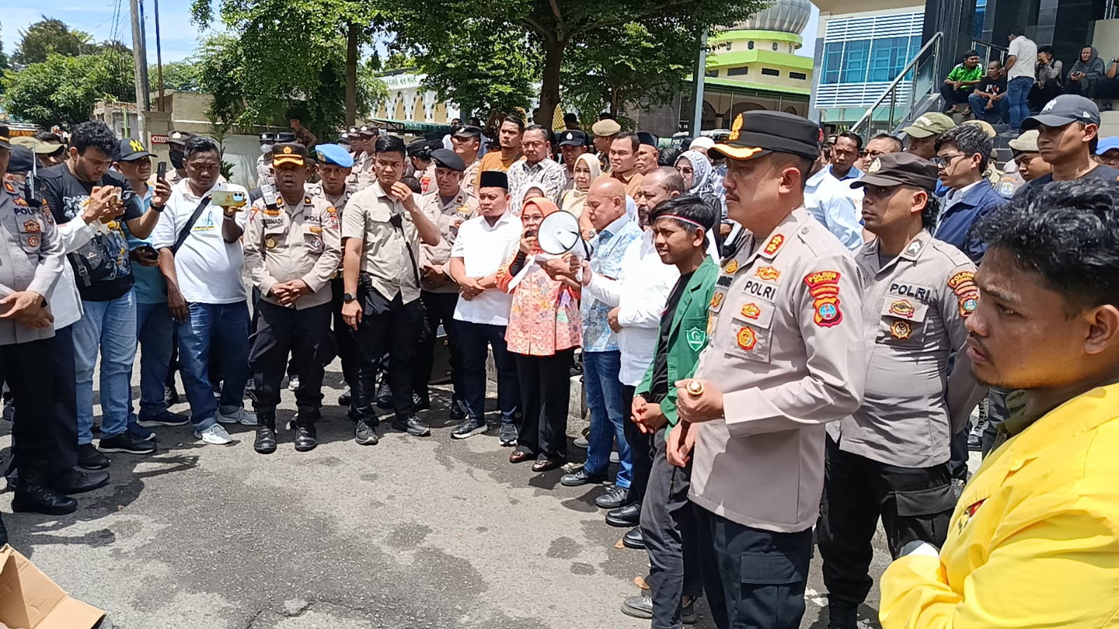 Walaupun dalam suasana hujan aksi unjuk rasa terap dilaksanakan dan Kapolres beserta personil pengamanan masih tetap mengawal jalannya aksi hingga wakil ketua I dprd H juli sawitna dan beberapa anggota menyampaikan jawaban atas tuntutan dari massa pengunjuk rasa