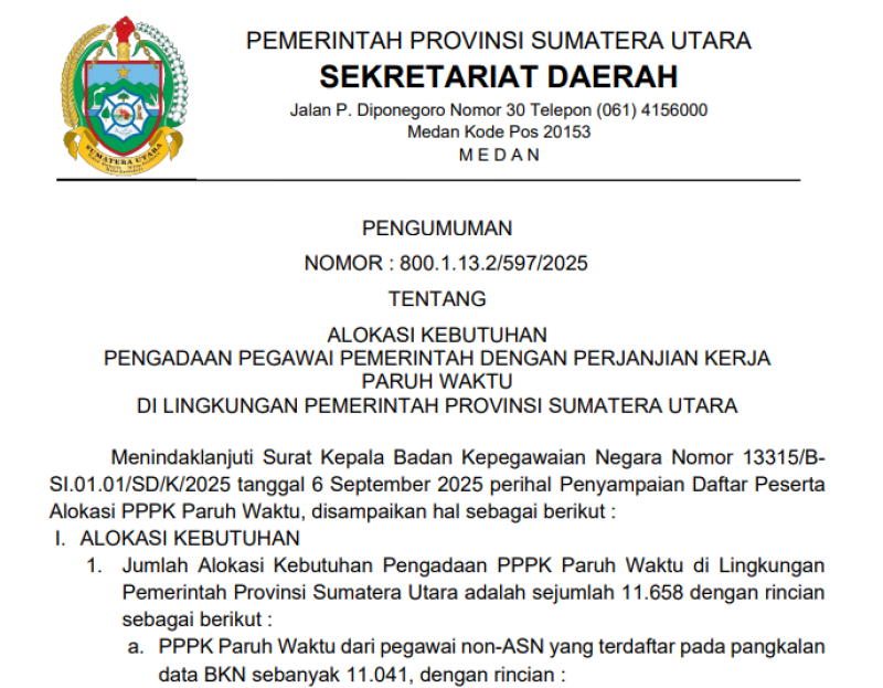 Berdasarkan pengumuman bernomor 800.1.13.2/597/2025 yang ditandatangani Sekda Sumut Togap Simangunsong pada 12 September 2025, total alokasi kebutuhan PPPK Paruh Waktu mencapai 11.658 formasi.