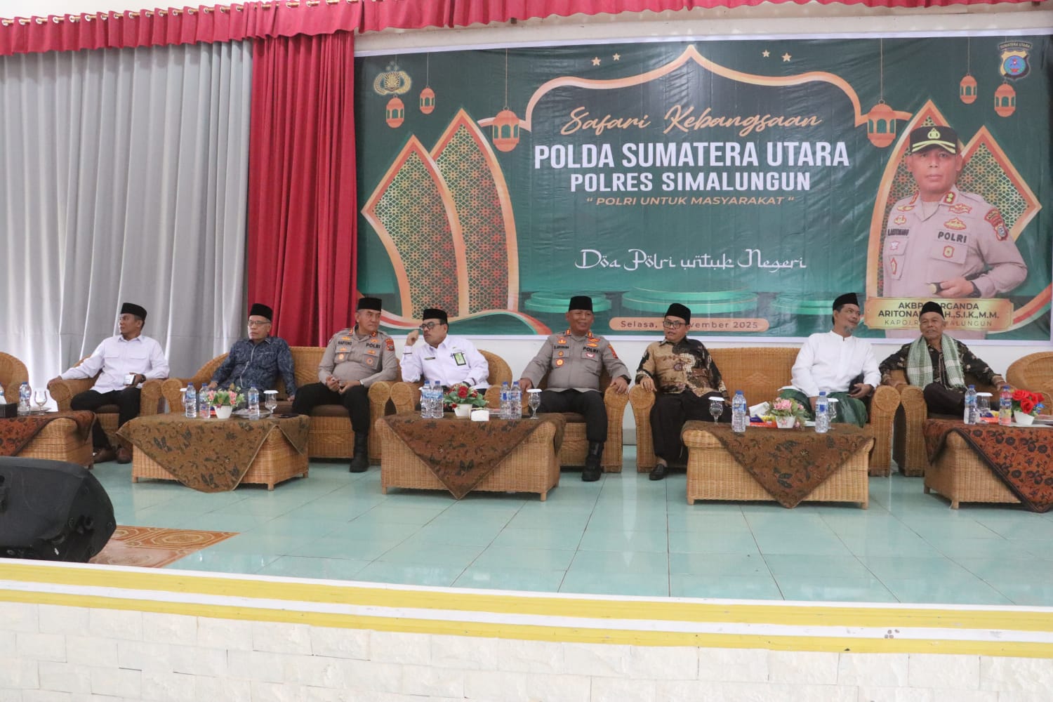Kegiatan tersebut dipimpin langsung oleh Kapolres Simalungun, AKBP Marganda Aritonang, S.H., S.I.K., M.M., serta dihadiri oleh Tim Safari Kebangsaan Polda Sumatera Utara yang terdiri dari AKBP Hartono, S.H., M.H., KH. Akhmad Khambali, S.E., M.M., Kyai Muhtarom, S.Ag., dan sejumlah perwakilan personel Polda Sumut.