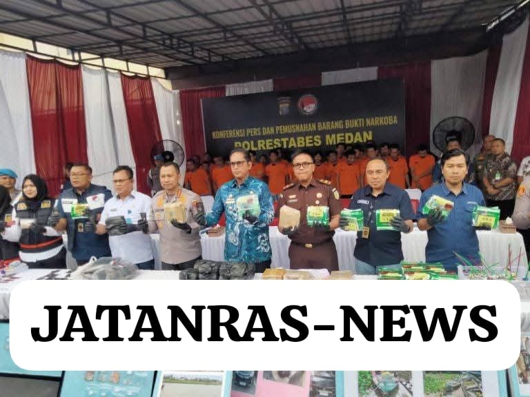 MEDAN, JATANRAS-NEWS.com || Polrestabes Medan menggelar konferensi pers pengungkapan tindak pidana narkoba dan pemusnahan barang bukti di Lapangan Apel Polrestabes Medan, pada Kamis (20/11/2025).