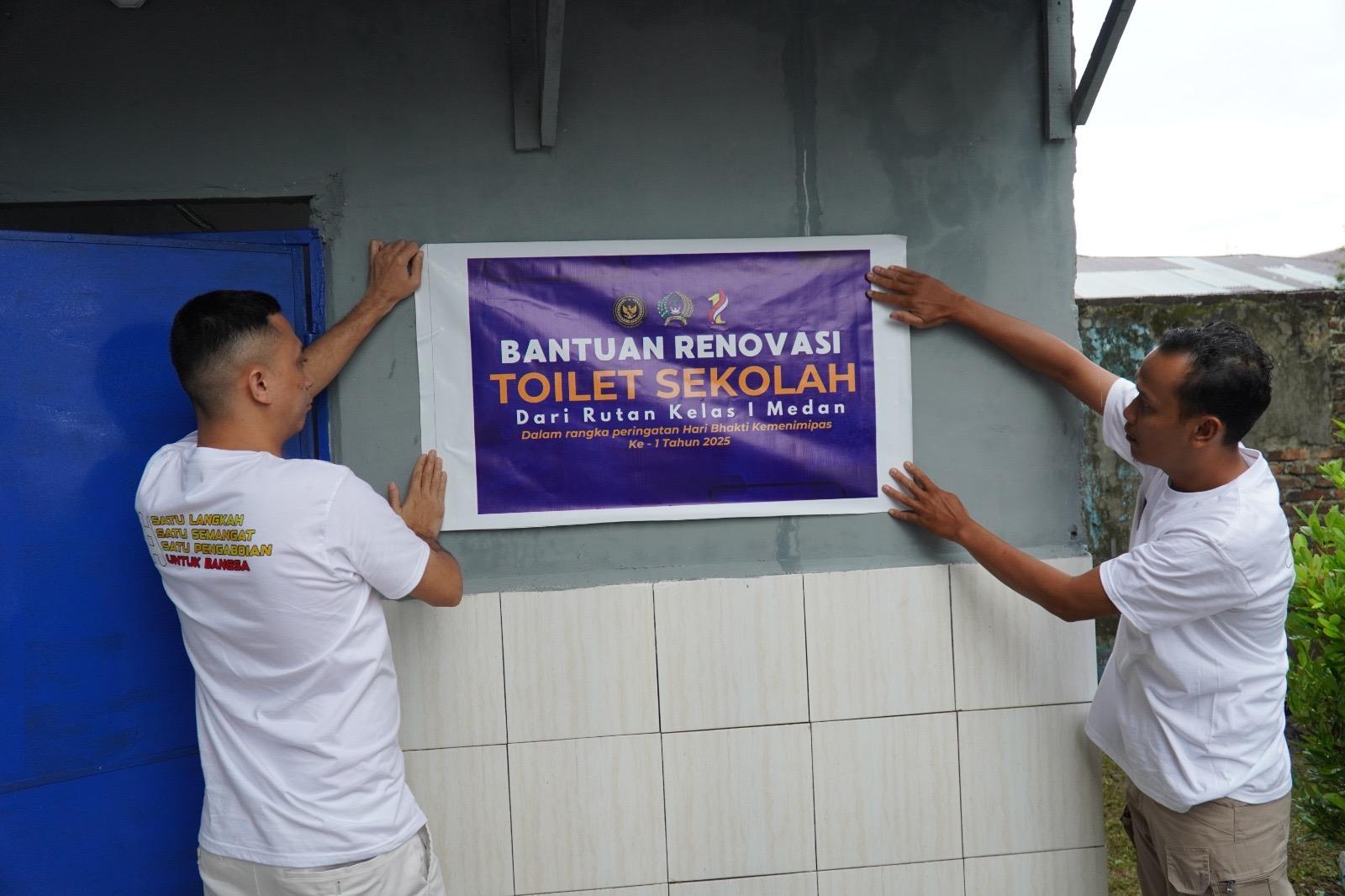 Medan, JATANRAS-NEWS.com — Masih dalam rangka memperingati Hari Bakti Kemenimipas ke-1 Tahun 2025, Rumah Tahanan Negara (Rutan) Kelas I Medan melaksanakan kegiatan sosial bertajuk “Imipas Peduli” dengan memberikan bantuan renovasi fasilitas toilet serta pembagian susu kepada siswa SD dan SMP Taruna Karya Medan, Jln. Lembaga Pemasyarakatan. Kegiatan ini sekaligus bertepatan dengan momentum Hari Guru Nasional, yang menambah makna tersendiri dalam upaya mendukung dunia pendidikan. Selasa (25/11/2025).