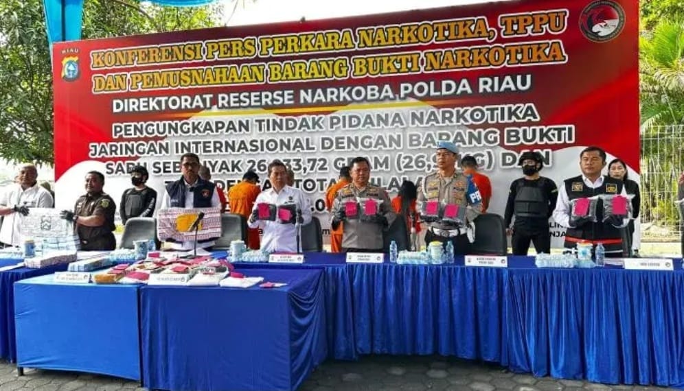 Pekanbaru, JATANRAS-NEWS.com — Direktur Reserse Narkoba Polda Riau Kombes Putu Yuda Prawira memimpin Konferensi pers pengungkapan kasus narkotika, Tindak Pidana Pencucian Uang (TPPU) dan pemusnahan barang bukti tindak pidana narkotika jaringan internasional dengan total sabu sebanyak 26.933,72 gram atau 26.93 kilogram (Kg). Sementara TPPU dengan nilai total aset lebih kurang Rp3.261.057.574, di Mapolda Riau, Selasa (2/12/2025).