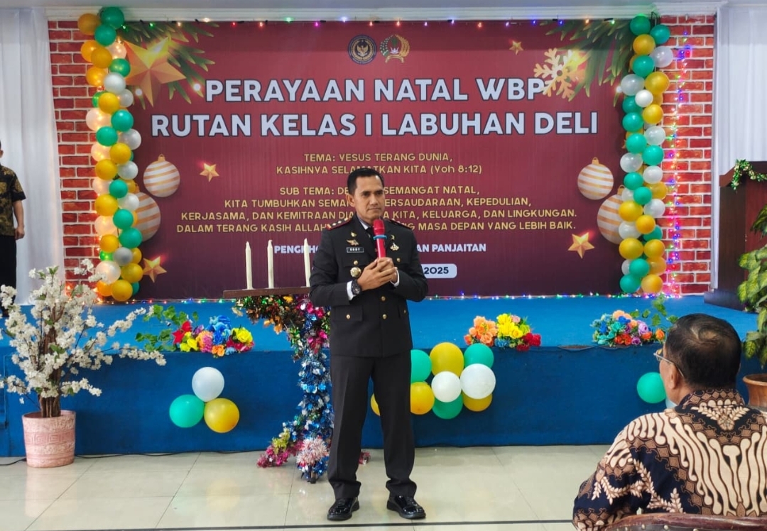Labuhan Deli,JATANRAS-NEWS — Rumah Tahanan Negara (Rutan) Kelas I Labuhan Deli menggelar perayaan Natal bagi Warga Binaan Pemasyarakatan (WBP) dengan penuh sukacita dan kepedulian sosial. Acara yang berlangsung di aula utama Rutan tersebut mengangkat tema “Yesus Terang Dunia, Kasih-Nya Selalu Bersama Kita” (Yohanes 8:12), serta subtema “Dengan Semangat Natal, Kita Tumbuhkan Semangat Persaudaraan, Kepedulian, Kerjasama, dan Keharmonisan di Antara Kita, Keluarga, dan Lingkungan”.