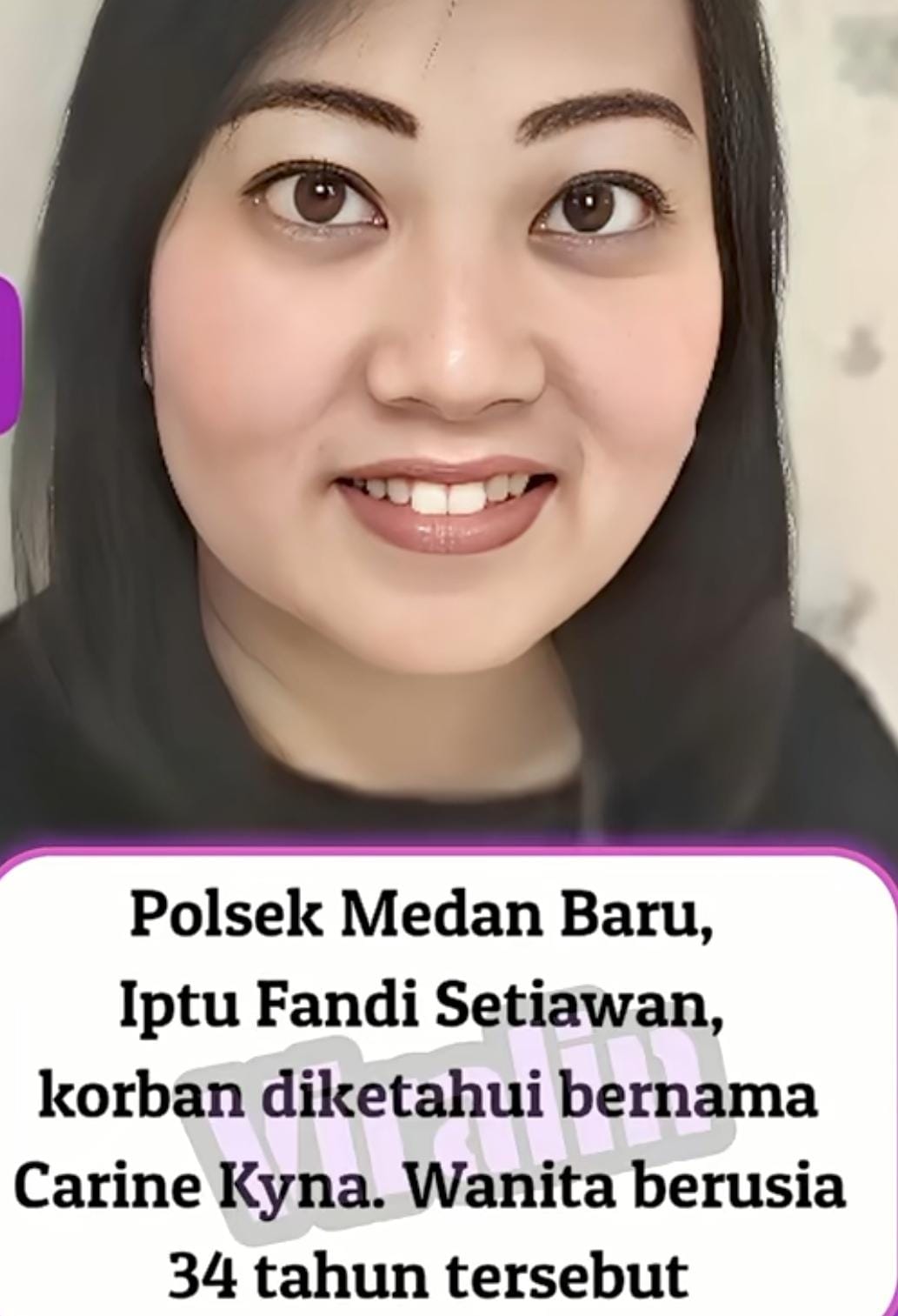 Kanit Polsek Medan Baru, Iptu Fandi Setiawan, menyebut korban bernama Carine Kyna (34), beralamat di Jalan Krakatau No. 231, PB Bengkel Baru, Medan Timur, Kota Medan, Sumatera Utara. Jasadnya telah diserahkan kepada pihak keluarga.
